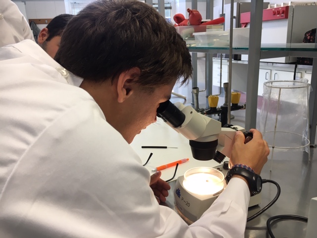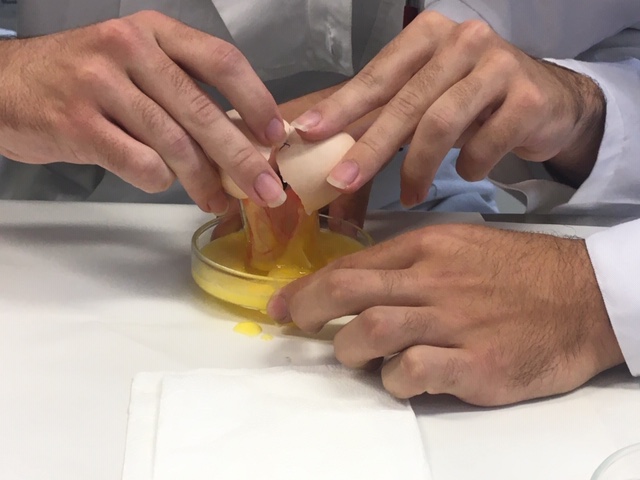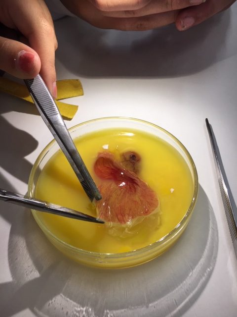 Na primeira atividade, Desenvolvimento Embrionário do Pinto, durante uma sessão de duas horas, os alunos assistiram à abertura de ovos fertilizados de galinha em diferentes fases de desenvolvimento, observando o método de isolamento do embrião a partir da gema do ovo. As imagens destes embriões vivos, depois de dispostos em caixas de Petri para melhor visualização, foram projetadas num monitor de alta resolução, de forma a todos os presentes poderem distinguir os seguintes fenómenos: 1. Diferenciação do coração; 2. Início do batimento cardíaco; 3. Sistema de circulação do sangue através das membranas circundantes; 4. Início do desenvolvimento cerebral; 5. Diferenciação e crescimento dos três compartimentos do encéfalo embrionário; 6. Início e desenvolvimento da segmentação da mesoderme em sómitos.