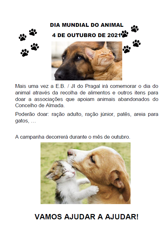 No dia Mundial do Animal as turmas realizaram algumas atividades alusivas ao tema. Nesse mesmo dia, deu-se início à campanha de recolha de alimentos para doar a associações que ajudam os animais abandonados. Este ano iremos entregar os alimentos e outros bens doados às Associações Onde há gato não há rato e ao Canil da Aroeira.