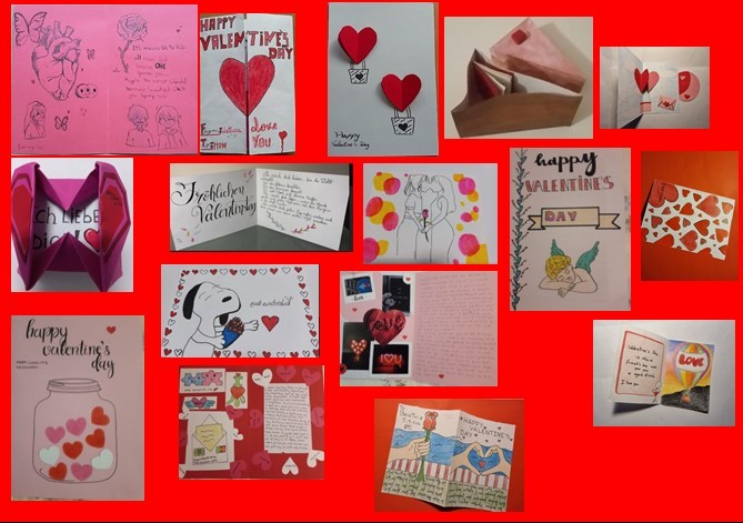 Os alunos do 3º ciclo (8º ano e 9º ano) realizaram a atividade Cartões do dia de S. Valentim no âmbito das disciplinas de Inglês e Alemão. Assim, através da elaboração de cartões alusivos ao tema com mensagens em Inglês e Alemão, os alunos desenvolveram as suas competências criativas e interculturais. Os alunos pesquisaram tópicos e símbolos relativos ao tema, desenvolveram conteúdos vocabulares e escreveram mensagens. Alguns dos postais foram partilhados entre turmas. A atividade decorreu em colaboração com a disciplina de Educação Visual em algumas turmas do 8º ano.