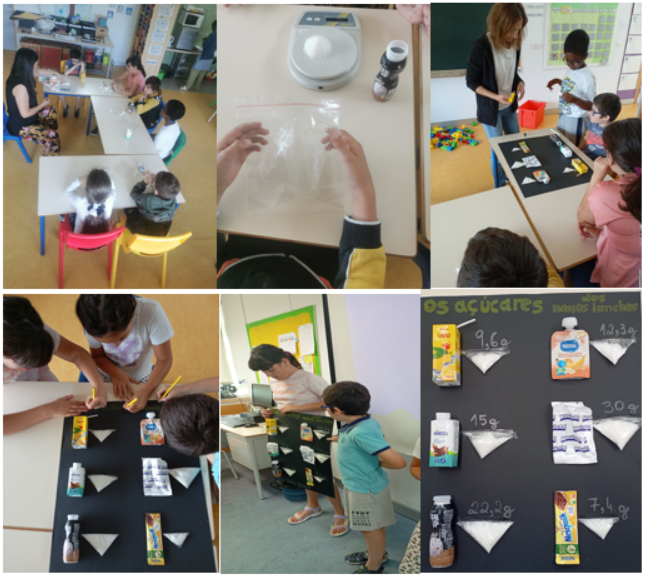 Depois de recolhidas embalagens, as crianças analisaram as tabelas nutricionais para aferir a quantidade de açúcar em cada uma delas, registaram os valores, pesaram e embalaram o açúcar para elaborar um cartaz de sensibilização.