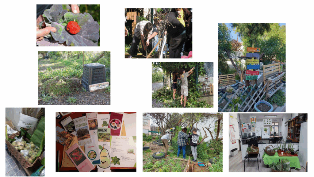 Tem vindo a realizar-se trabalho prático, semanal, no espaço da horta biológica (HB), nomeadamente recolha de algumas espécies plantadas no final do ano letivo anteior (batata doce, couves); preparação dos terrenos para novas plantações/sementeiras (final do inverno/início da primavera); início do arranjo de espaços na horta (algumas cercas); preparação de estufas (garrafões protegendo as alfaces plantadas); apanha de alguns seres vivos (caracóis) e seu transporte para outros espaços da escola; atribuição de um canteiro aos alunos da Unidade de Multideficiência promovendo a inclusão e fomentando uma aprendizagem in loco; criação de um espaço junto da HB para uma turma do Ensino Secundário no âmbito de Cidadania e Desenvolvimento e da dimensão “Desenvolvimento Sustentável”; atividades no âmbito de algumas disciplinas, Geografia, Ciências Naturais e Inglês, neste caso uma atividade CLIL no âmbito da “Compostagem”; a prática da compostagem; aulas junto do espaço da horta, interligando com o clima, vegetação mediterrânica, tipo de solos (11º ano e 9º ano).